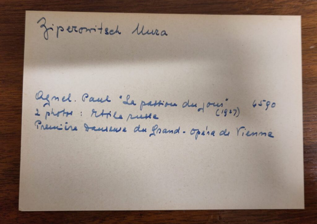 Als Archivalie des Monats möchten wir im Dezember eine Karteikarte Derra de Morodas vorstellen, die auf das Thema der „Lücke“ oder Leerstelle des Archivs aufmerksam macht. Es handelt sich um die Karteikarte zur Tänzerin Mura Ziperowitsch, die nicht viel mehr als eine Quelle sowie die Information „Première Danseuse du Grand-Opéra de Vienne“ offenbart.